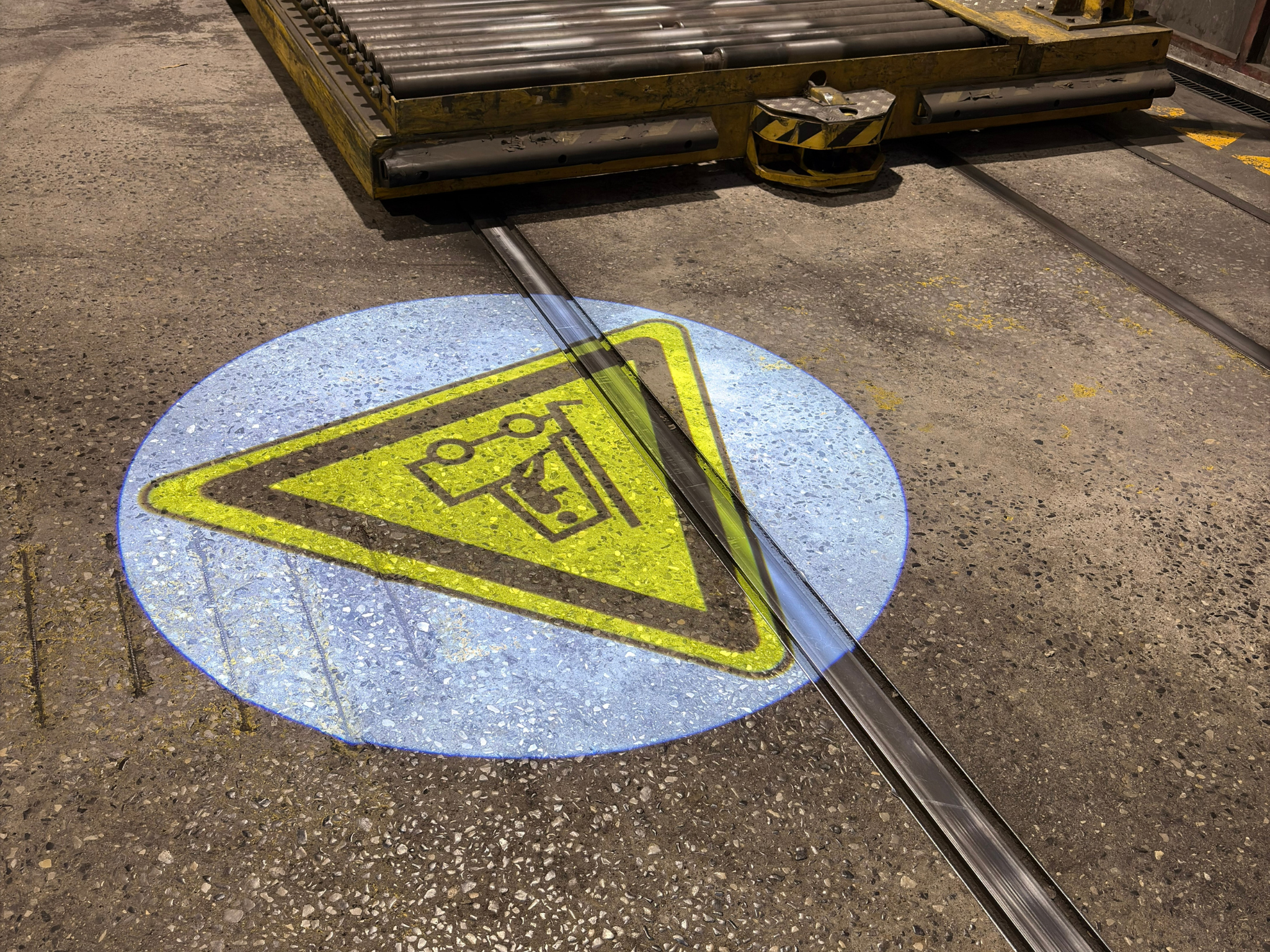 “Wij hebben een druk kruispunt waar een automatische trein rijdt en ook verschillende heftrucks passeren. Los van spiegels en markeringen hebben wij als extra controle gekozen voor een geprojecteerd zebrapad wanneer er geen gevaar dreigt voor de voetganger. . In het andere geval verschijnt er een waarschuwingspictogram op de grond dat wijst op het gevaar van vorkheftrucks.”